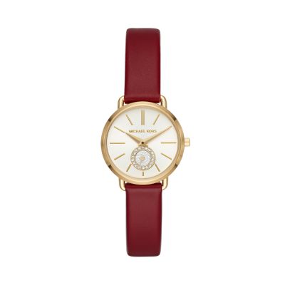 Similar ones also available. Fast Delivery Quick Refund. A deep red leather strap cradles a pavé-accented dial on this fantastic Petite Portia watch by Michael Kors.